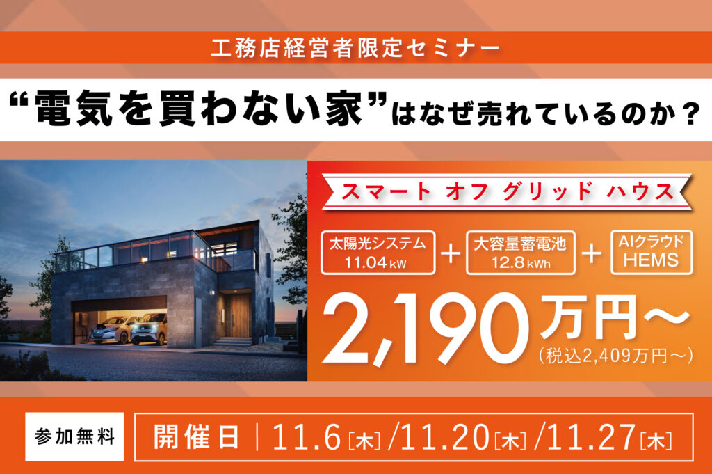 売れる商品には、必ず「買う理由」がある。 競合他社が提供できない、圧倒的な強み。 他社が真似できない、本質的な差別化とは⁉それはUa値でもC値でもありません。 断熱性能も気密性能も最終的には、明確な【kWh】という自家消 … 続きを読む 電気を買わせない暮らし方の提案 お客様が買う理由のある商品づくり徹底解説セミナー